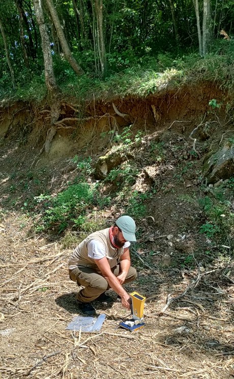 Spyros analyzing the rock samples in the field with a portable XRF instrument to assess their geochemical signature.